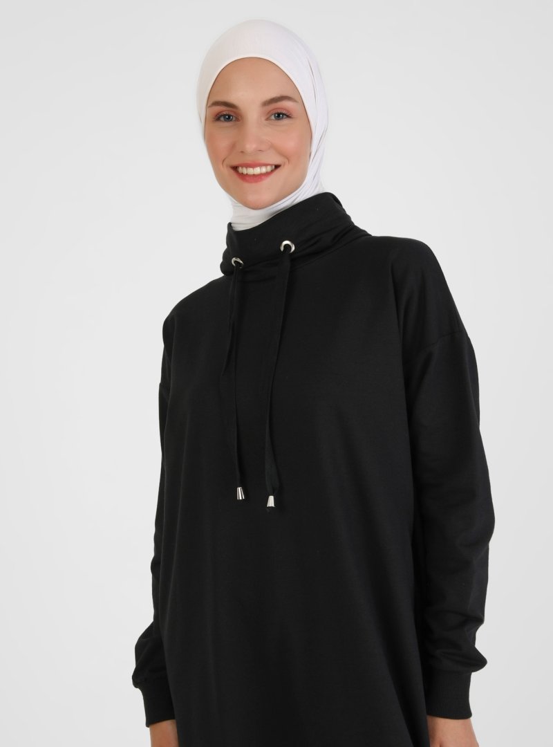 Refka Siyah Boğazlı Yaka Cepli Uzun Sweatshirt