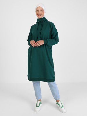 Refka Boğazlı Yaka Cepli Uzun Sweatshirt Orman Yesili