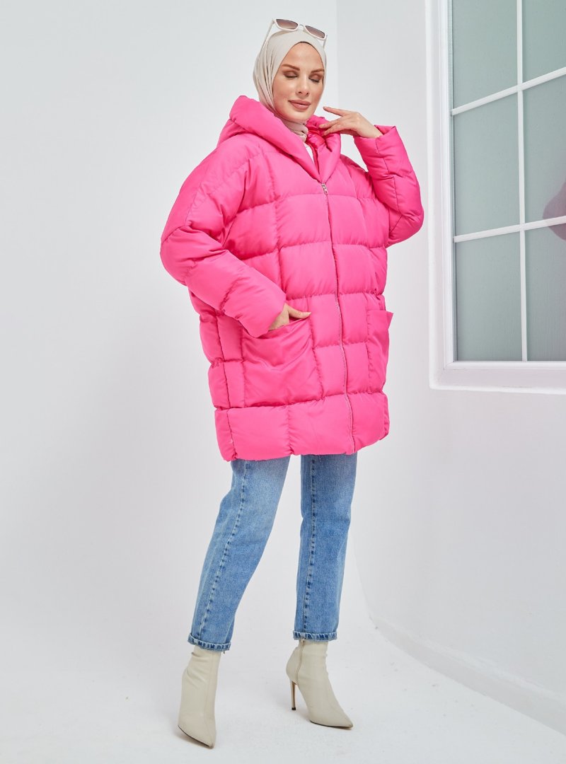 Burcu Tesettür Fuşya Kapüşonlu Şişme Kısa Mont