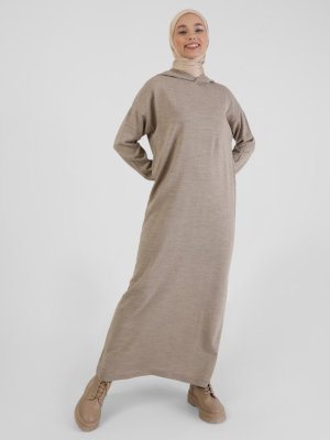 Benin Kapüşonlu Triko Elbise Açık Vizon