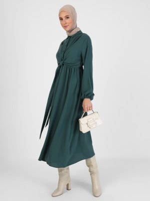 Refka Koyu Zümrüt Bağlama Detaylı Elbise