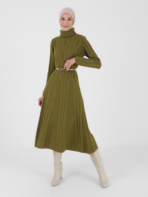 Refka Fıstık Yeşili Boğazlı Yaka Örgü Detaylı Triko Elbise
