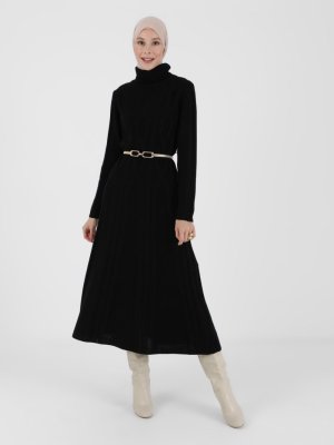 Refka Siyah Boğazlı Yaka Örgü Detaylı Triko Elbise
