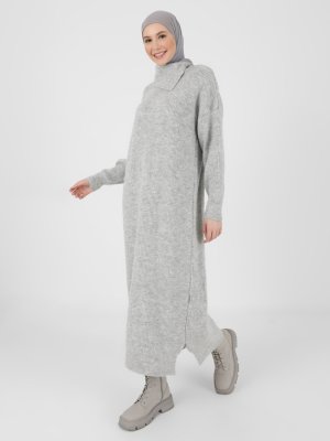 Refka Gümüş Melanj Yaka Detaylı Triko Elbise