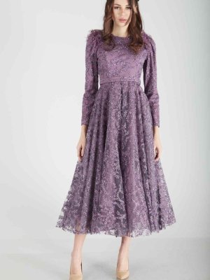 Ardanewline Lavanta Omuzları Tüy Detaylı Sim İşlemeli Abiye Elbise