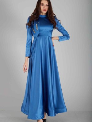 Ardanewline İndigo Parça Kumaş Detaylı Ve Boncuk İşlemeli Abiye Elbise