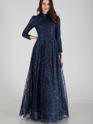 Ardanewline Lacivert Üzeri Sim İşlemeli Abiye Elbise