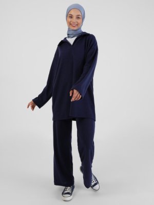 Refka İndigo Yumoş Kumaş Tunik & Pantolon İkili Takım
