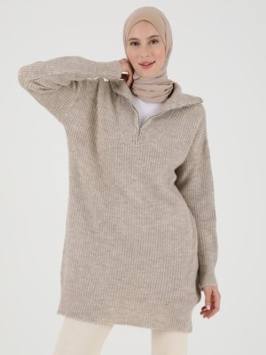 Refka Bej Melanj Yakası Fermuarlı Yumuşak Triko Tunik