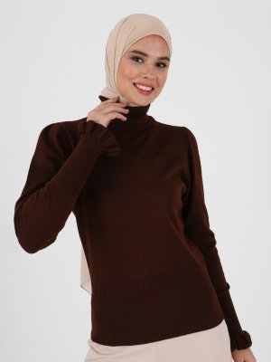 Refka Kahverengi Fırfır Detaylı Boğazlı Yaka Triko Kazak