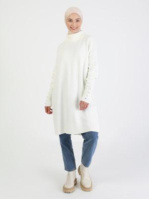 Benin Ekru Düğme Detaylı Yüksek Yaka Triko Tunik