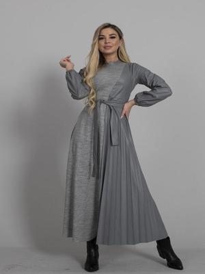 Ardanewline Gri Yanı Detaylı Piliseli Deri Triko Elbise