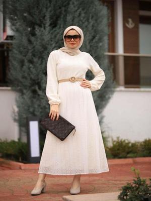 Cng Moda Beyaz Danteli Astarlı Hasır Kemerli Elbise