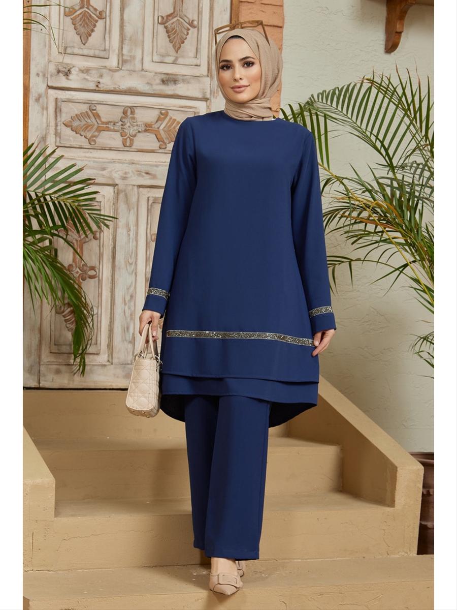 VAVİNOR İndigo Taş Detaylı Tunik Pantolon Abiye Takım