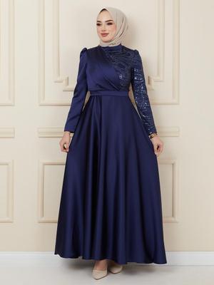 Olcay Lacivert Volan Ve Payet Detaylı Saten Abiye Elbise