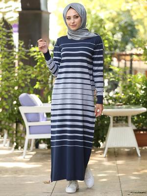 İnşirah Lacivert Triko Çizgili Elbise