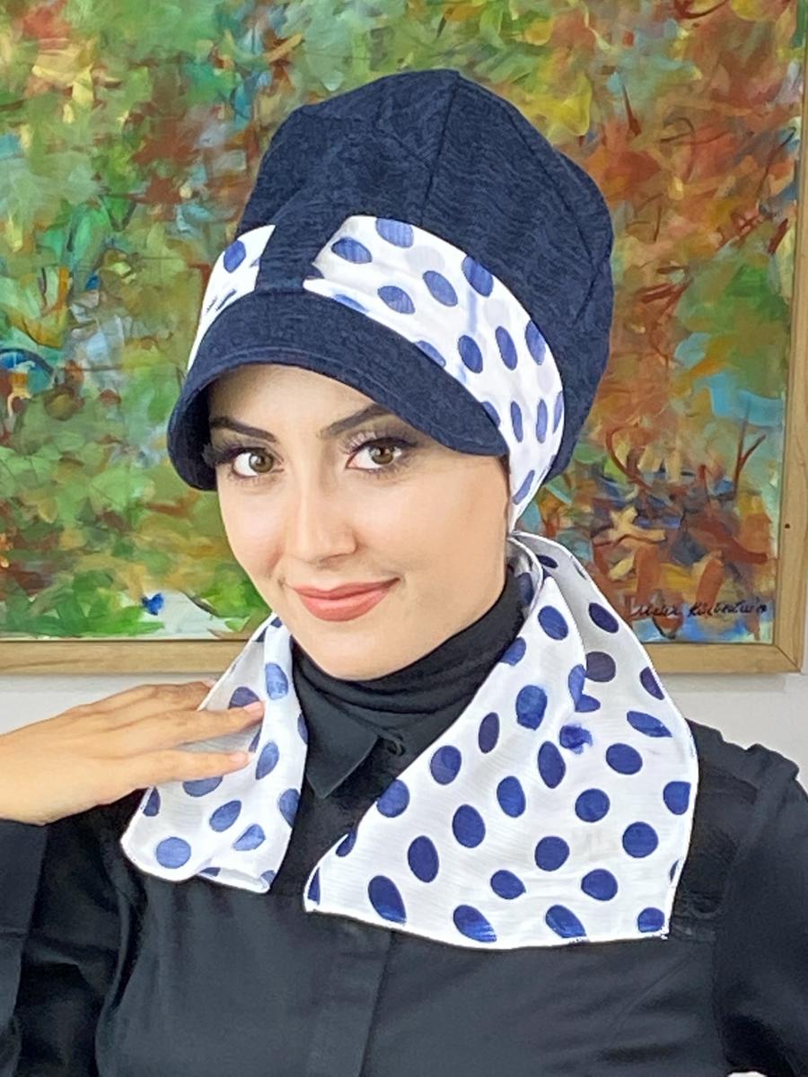 BUTİK AMBAR Çarkıfelek Puantiyeli Fularlı Atkılı Lacivert Şapka