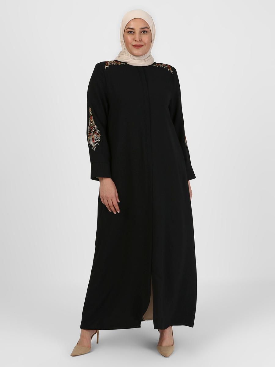 Mevanur Tesettür Siyah Büyük Beden Boydan Fermuarlı Nakışlı Ferace