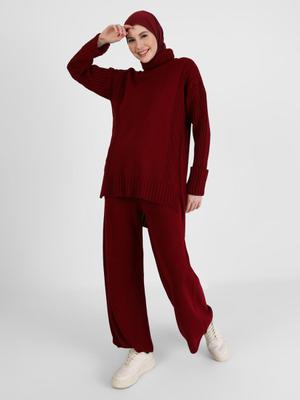 Refka Bordo Yüksek Yaka Arkası Uzun Triko Takım