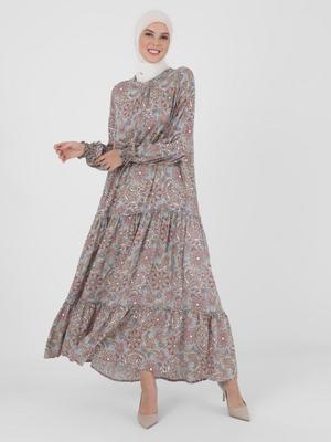 Refka Gri Pembe Doğal Kumaşlı Şal Desenli Elbise