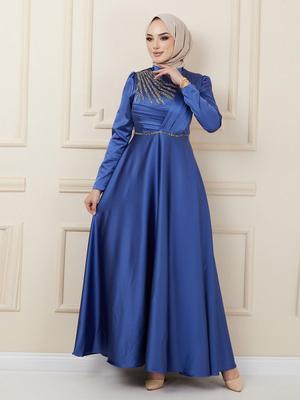 Olcay Önü Pilise Ve Boncuk Detaylı Saten Abiye Elbise Koyu İndigo