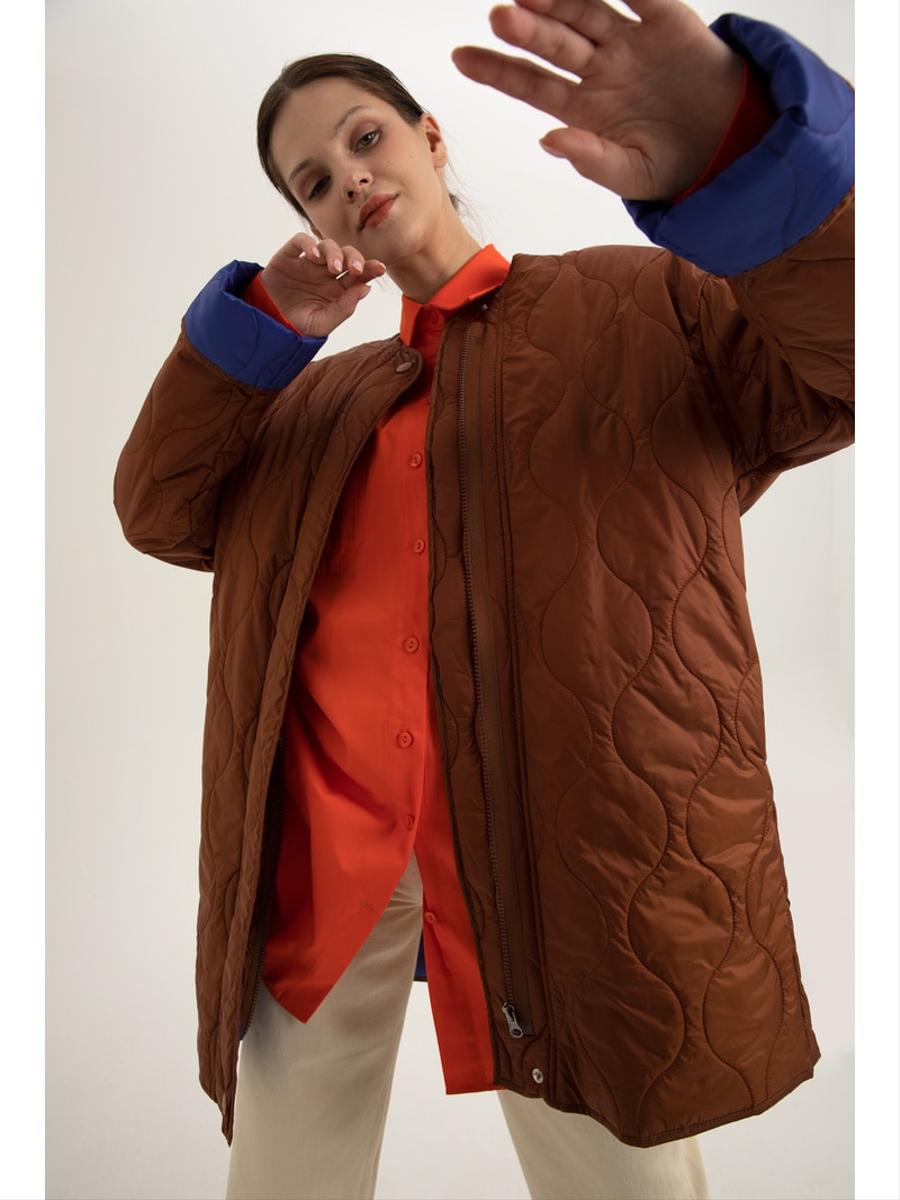 Allday Kahve Oversize Kolları Katlamalı Fermuarlı Kapitone Mont