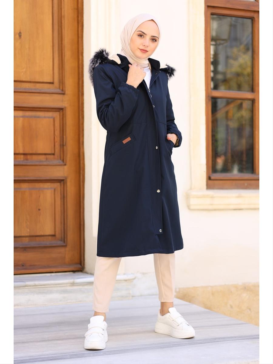 Benguen Lacivert Kapüşonlu İçi Kürklü Bondit Kaban