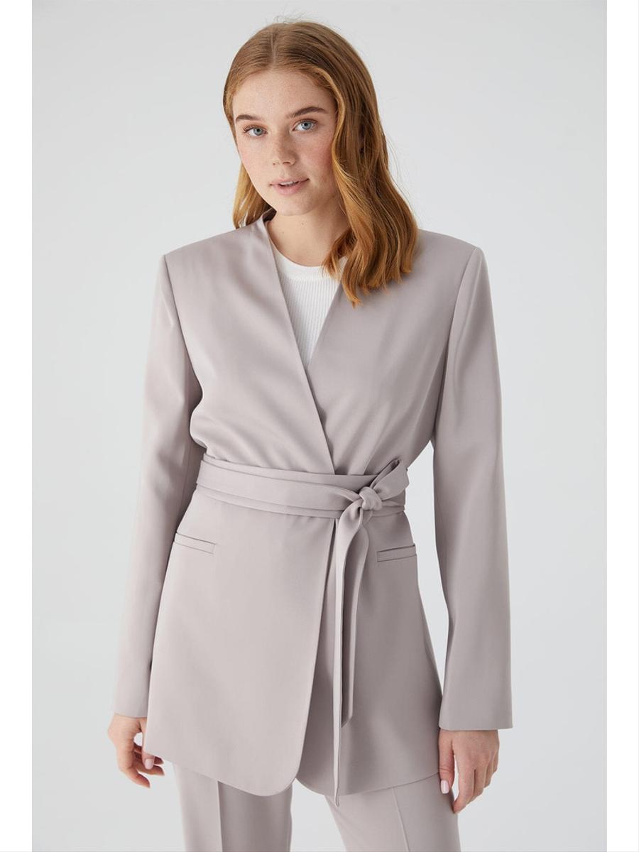 MANUKA Kemerli Yakasız Saten Blazer Ceket Taş