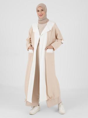 Refka Bej Renk Bloklu Cep Detaylı Abaya Ferace