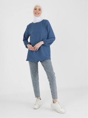Refka Koyu İndigo Ucu Lastikli Balon Kol Aerobin Bluz