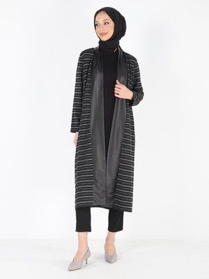 PLİSTRE Siyah Kuşak Detaylı Çizgili Hırka
