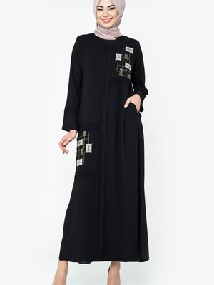 Beyza Siyah Fermuarlı Nakışlı Etnik Detaylı Ferace