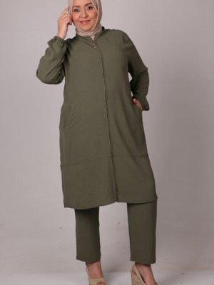 Moda Rosa Haki Büyük Beden Önü Fermuarlı Airobin Pantolonlu Takım