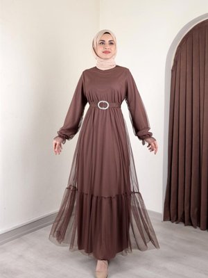 Ensa Tesettür Melisa Tül Kahverengi Abiye Elbise