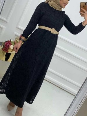 Cng Moda Siyah Danteli Astarlı Hasır Kemerli Elbise