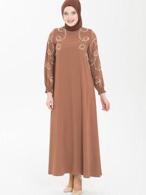 Beyza Kahve Nakış Ve İnci Detaylı Elbise