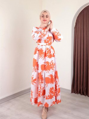 Ensa Tesettür Yaprak Desen Kampanyalı Turuncu Elbise