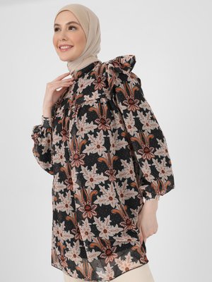 Refka Siyah Çiçek Desenli Astarlı Şifon Tunik