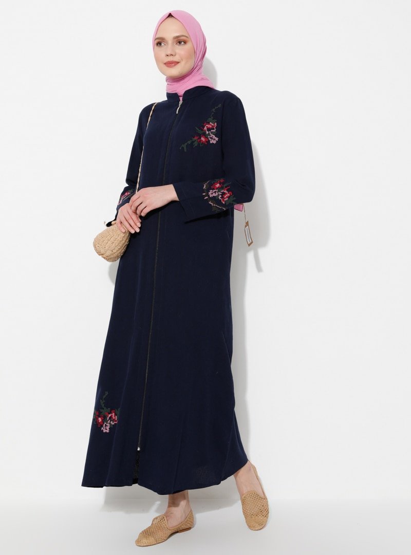 ELİŞ ŞİLE BEZİ Lacivert Elis Şile Bezi Nakış Detaylı Fermuarlı Ferace