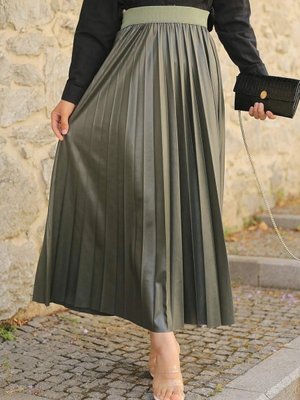 Cng Moda Haki Yüksek Bel Piliseli Deri Görünümlü Uzun Etek