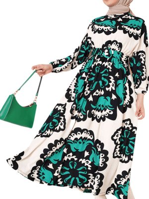 Butik Buruç Yeşil Desenli Kemerli Uzun Elbise