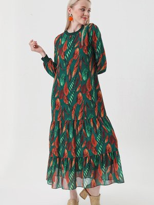 Butik Buruç Yeşil Tütün Turuncu Desenli Uzun Şifon Elbise