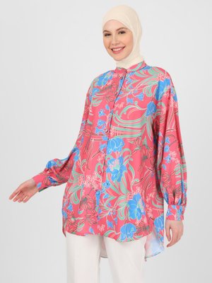 Refka Mercan Mavi Çiçek Desenli Hakim Yaka Oversize Saten Tunik