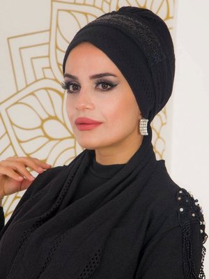 AİŞE TESETTÜR Çok Renkli Siyah Işıltı Atkılı Abiye Bone