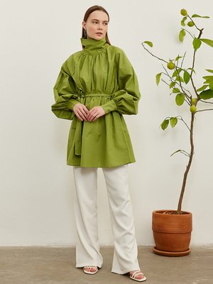 Ceylan Otantik Fıstık Yeşili Yakalı Balon Kol Tunik