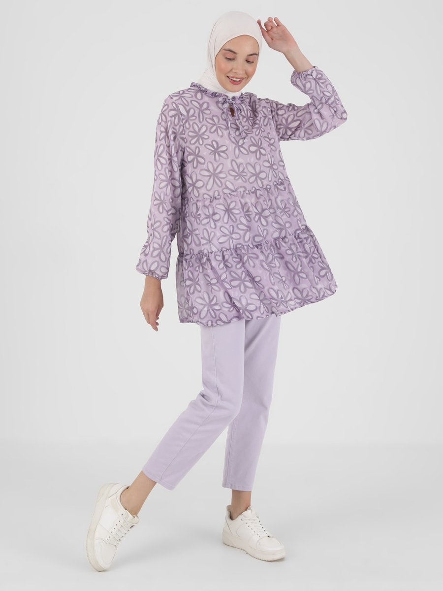 Benin Lila Çiçek Desenli Astarlı Şifon Tunik