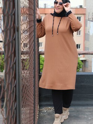 Moda Rosa Kahverengi Büyük Beden Kapüşonlu Penye Pantolonlu Takım