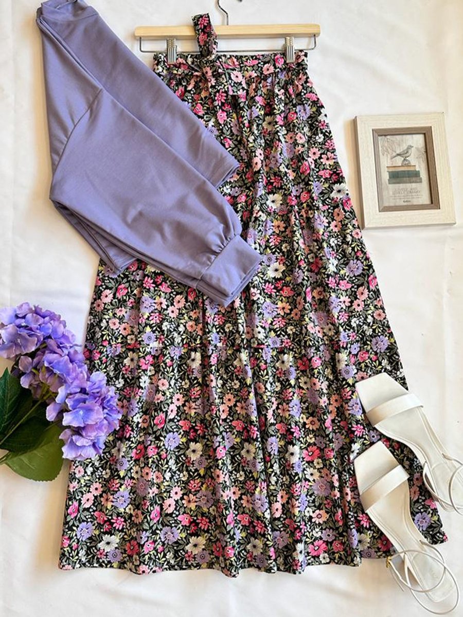 Ceylan Otantik Home Lila Crop & Tabanı Siyah Mor Menekşe Desenli Kat Kat Etek