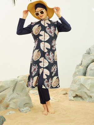 Starinci Mayo Lacivert Beyaz Yapraklı Tam Kapalı Hızlı Kuruyan Mayo