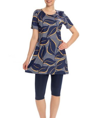 Starinci Mayo Lacivert Kol Kısakol Yaprak Desenli Mayo